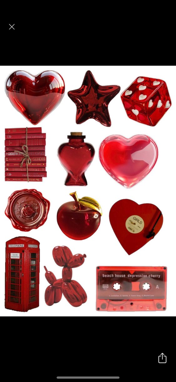 Kırmızı renkli, kalp, yıldız, zar ve dekoratif objelerden oluşan renkli yeni yıl süsleri seti. Canlı parlaklıkla dikkat çeker. ❤️