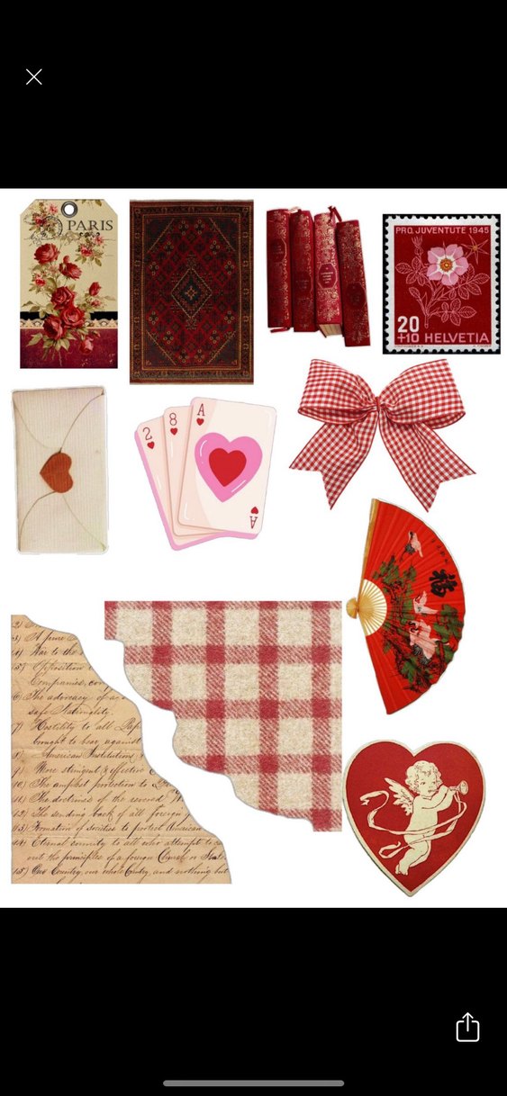Kırmızı tonlarında kalp zarf, oyun kağıtları, ekose fiyonk, yelpaze ve vintage tarzda kağıt süslemelerden oluşan Yeni Yıl temalı set.