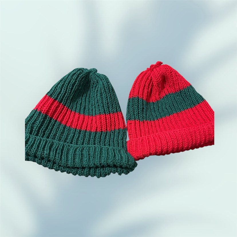 Yeşil ve kırmızı renklerde, örgü el emeği bereler.Rahat ve karşı kültür tarzıyla, yumuşak antialerjiktir iple örülmüştür. Görselde kırmızı ana renk olan ürün içindir.