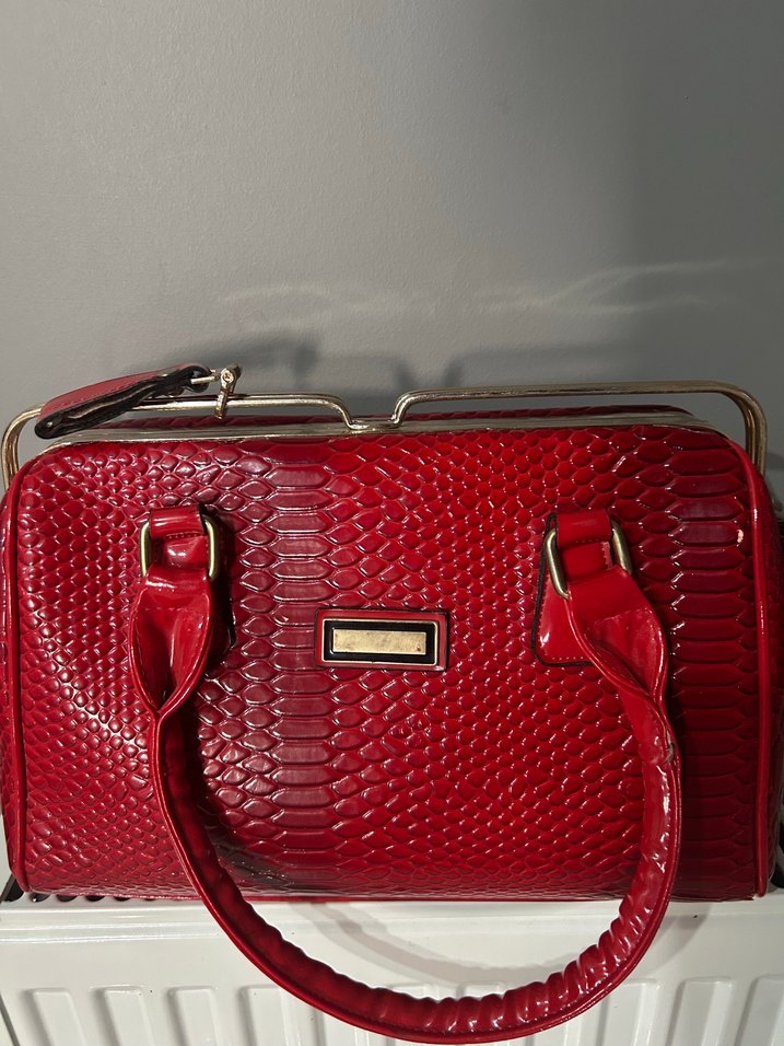 Parlak kırmızı deri, yılan derisi desenli ve fermuarlı kadın çanta, klasik zarafeti modern dokunuşla birleştirir.