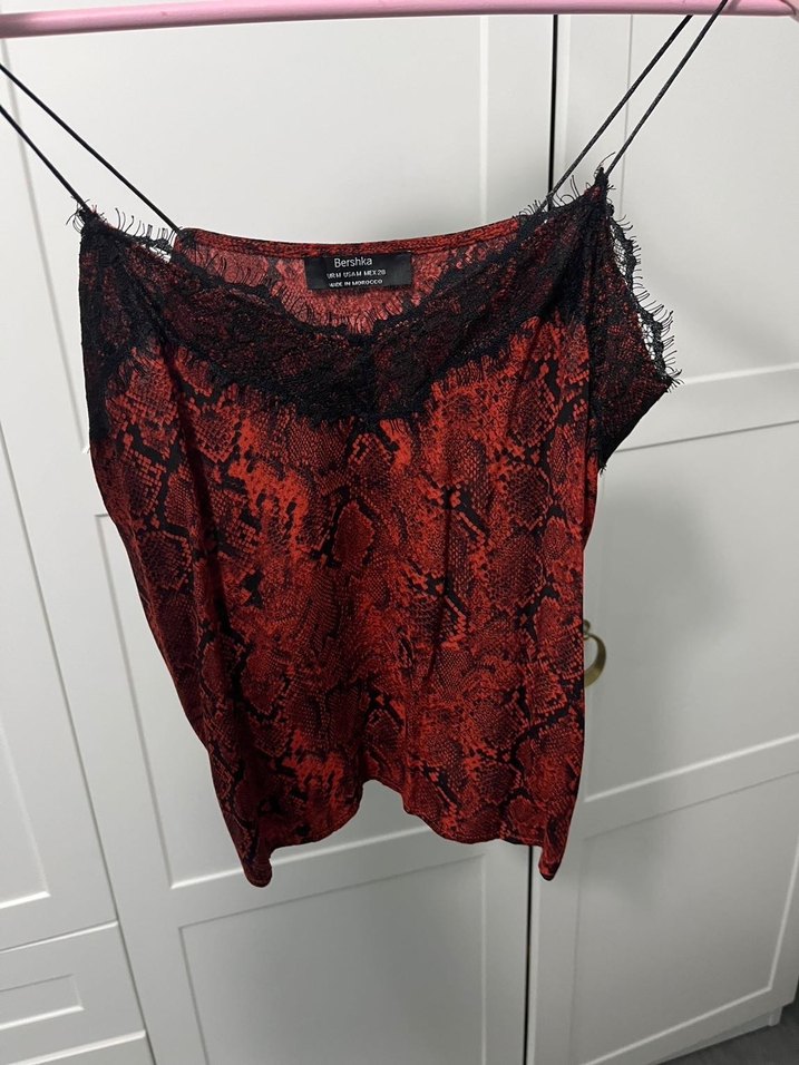 Kırmızı yılan derisi desenli bluz, siyah dantel detaylı halter yaka ve drapeli, bol kesimlidir. İnce askılı ve mini boyda, gotik tarz için uygundur.