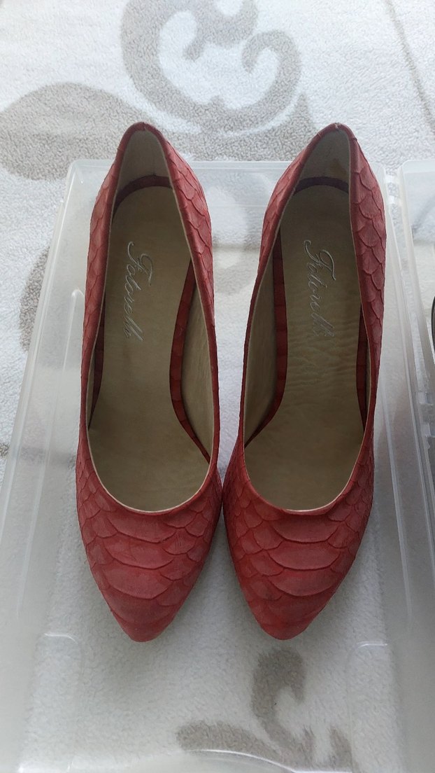 Kırmızı deri, parlak yılan derisi desenli, pileli detaylı stiletto topuklu kadın ayakkabı. Ro mantik gece için çağdaş ve cesur tasarım. kirmizi pembe renk arasindadir