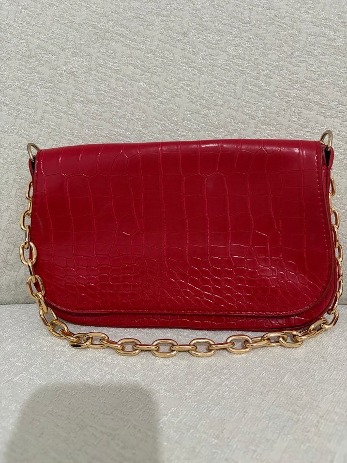 Kırmızı Yılan Derisi Desenli Zincir Detaylı Çanta