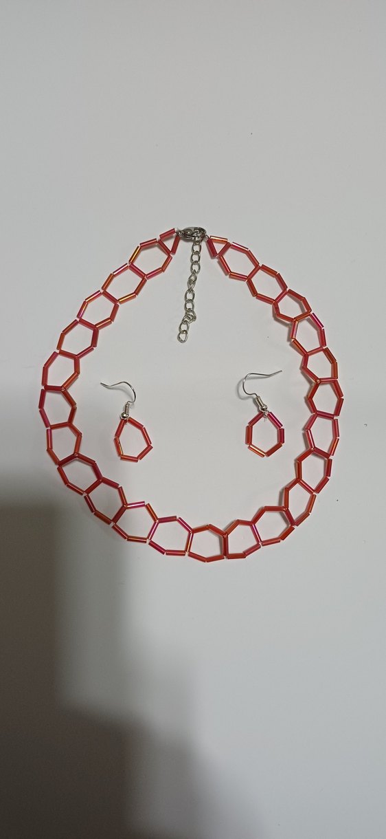 Kısa uzunlukta, kırmızı renkli yılan desenli boncuklardan oluşan kolye ve küpe seti, günlük kullanıma uygundur.