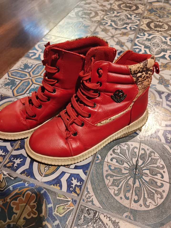 Kırmızı deri, yılan desenli renkli topuklu botlar, bağcıklı tasarımıyla sokak stiline uygun. Günlük kullanım için ideal.