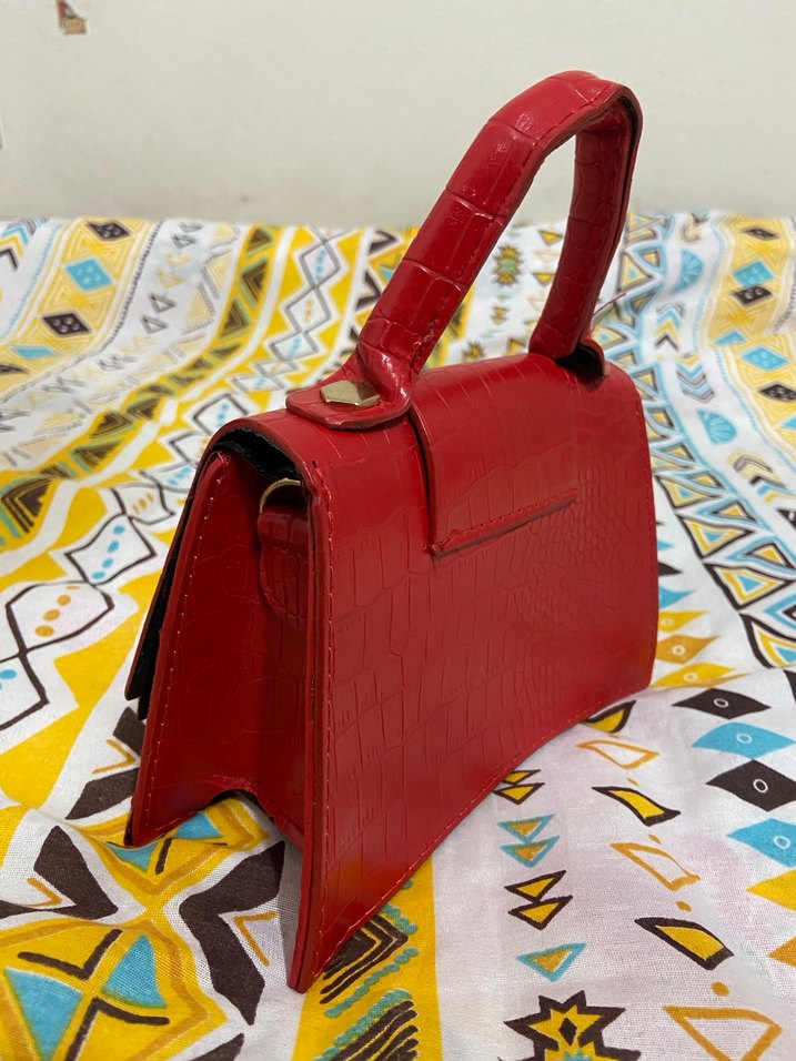 Kırmızı yılan desenli deri çanta, tokalı sapıyla sokak stiline uygun ve günlük kullanıma ideal.