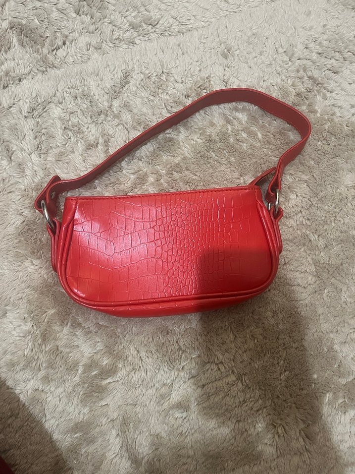 Kırmızı deri malzemeden, parlak yılan desenli ve tokalı askılı kadın çantası. Minimalist ve günlük kullanıma uygun.