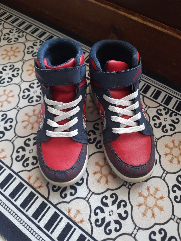 Kırmızı yılan desenli, renkli erkek çocuk spor ayakkabısı. Kauçuk tabanlı ve cırt cırtlı, sokak stili için uygundur.