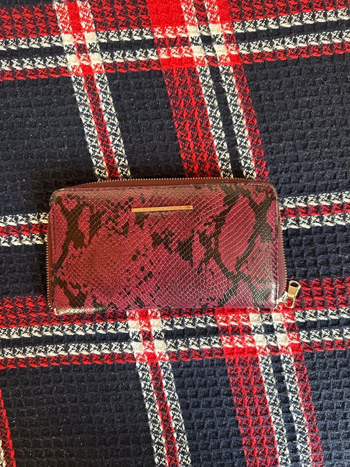 Koyu kırmızı yılan desenli, sentetik kumaştan fermuarlı kadın cüzdan. Bohem ve retro tarzlara uygun, günlük kullanıma ideal. Biraz yıpranmalar mevcut fotoğraflarda görebilirsiniz