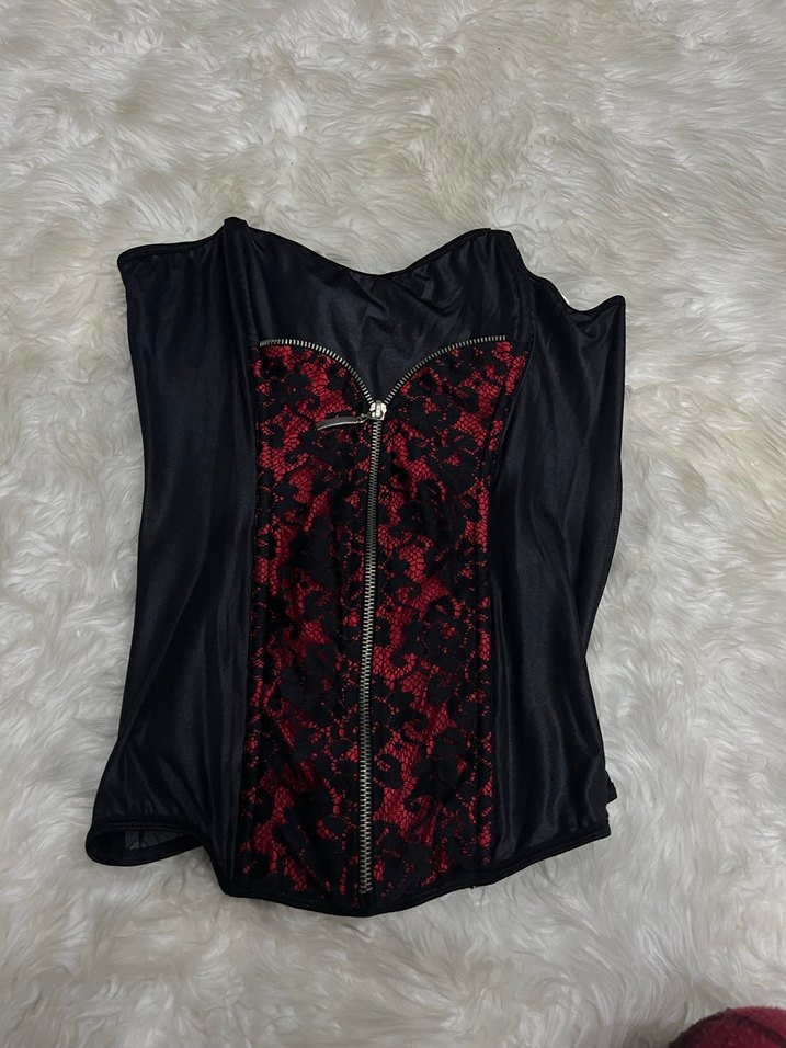 Kırmızı yılan desenli, fermuarlı ve straplez olan bu gotik büstiyer, sentetik kumaştan yapılmış ve vücuda oturan bir kesime sahiptir.
