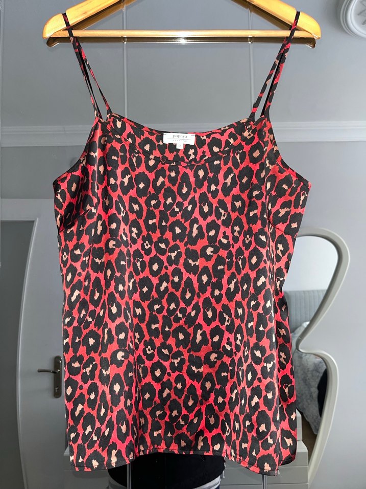 İp askılı, straplez yaka ve bol kesim kırmızı bluz. Satenimsi kumaş üzerinde koyu yılan desenli, şık ve rahat bir tasarım.
