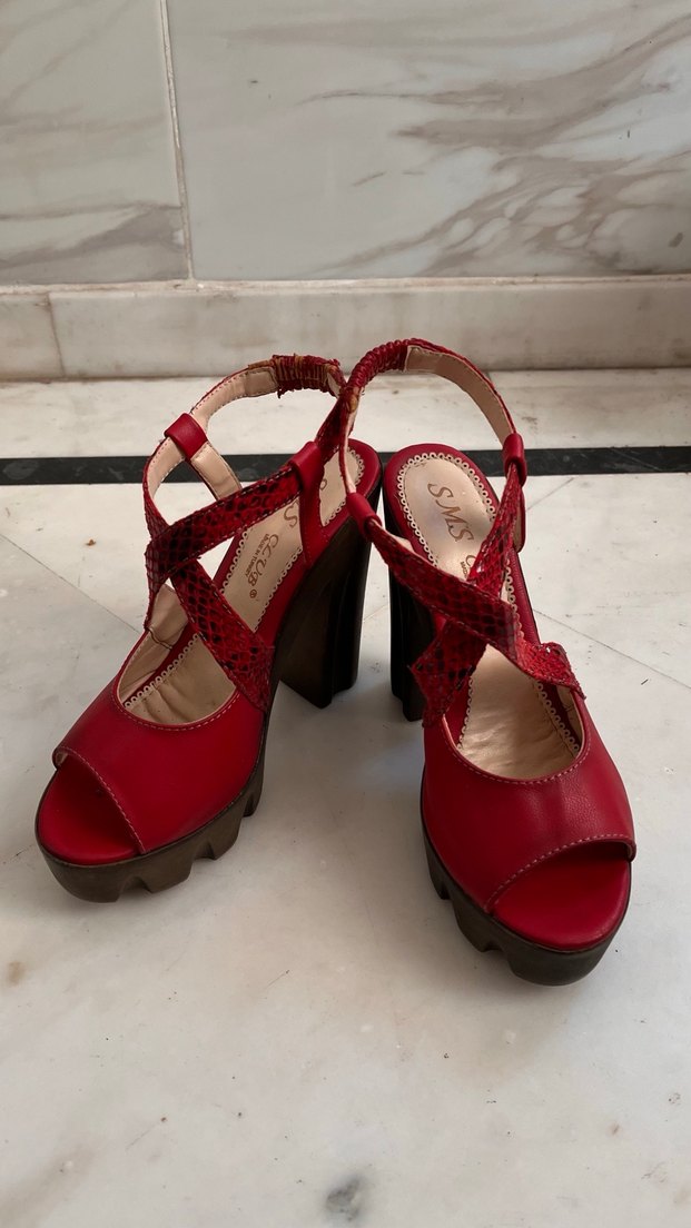 Kırmızı yılan desenli, tokalı platform topuklu kadın ayakkabısı. Kauçuk malzemeden, cesur ve renkli tasarım, romantik buluşmalar için uygun. Sadece arka lastik kısmında dökülme var başka hiçbir sorunu yok sıfır ayarında