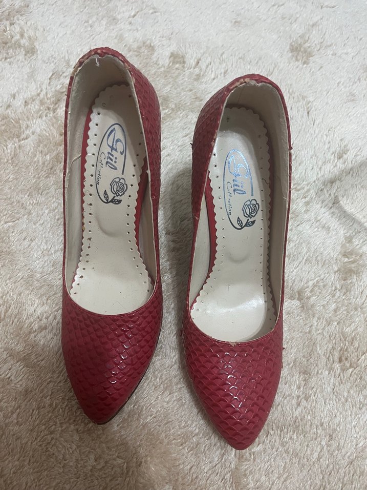 Kırmızı yılan desenli, kürklü ve kauçuk malzemeden yapılmış stiletto topuklu klasik kadın ayakkabısı. Günlük kullanıma uygun.