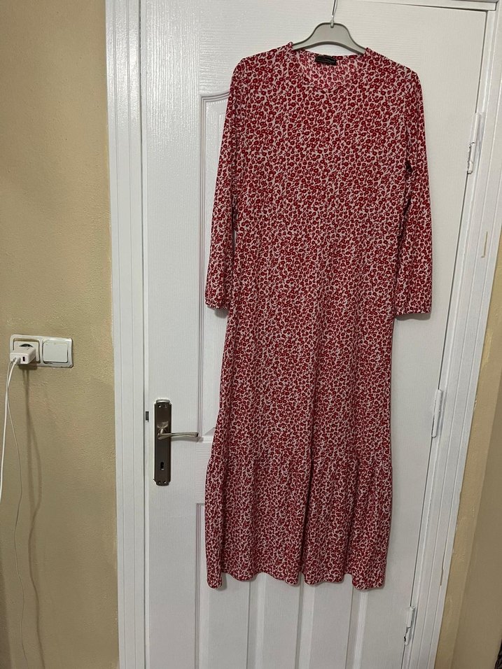 Koyu kırmızı yılan desenli, uzun kollu ve bol kesim kadın elbisesi. Yüksek yakalı ve dökümlü, sentetik kumaştan günlük kullanım için uygundur.