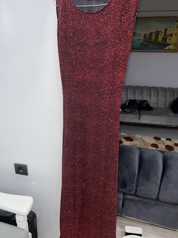 Koyu kırmızı yılan desenli, drapeli ve kolsuz uzun elbise. V yaka kesimiyle romantik gece için uygun, sentetik kumaştan rahat bir tarz sunar. Standart bedendir.