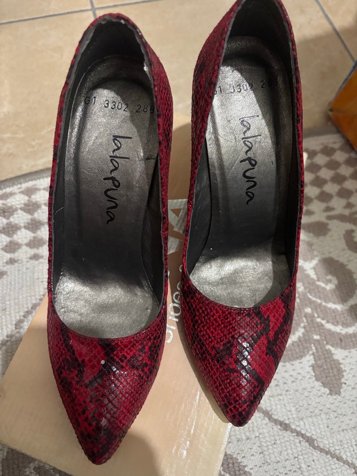 Kırmızı yılan deseni ve bağcıklı detaylarıyla yüksek topuklu stiletto. Kauçuk malzemeden yapılmış, gösterişli ve cesur bir tarz sunar. Marka: lalapuna.