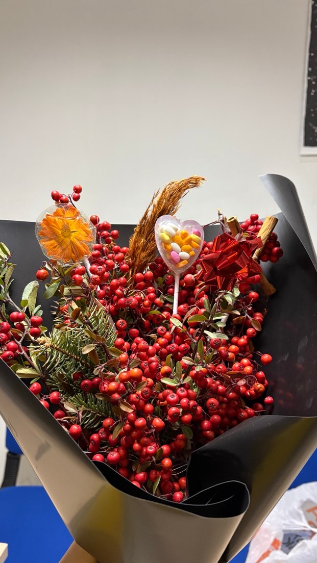 Koyu kırmızı meyveler, kurutulmuş meyveler ve dekoratif detaylarla siyah kağıda sarılı yılbaşı buketi.