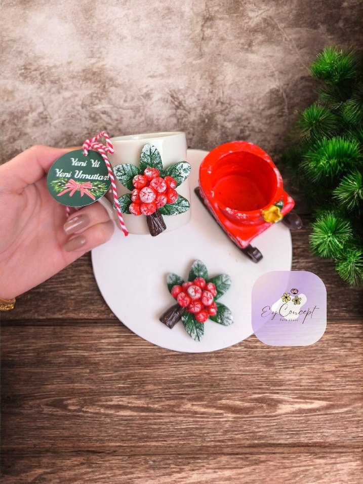 Kırmızı iç kısmı ve kulp üzeri yılbaşı temalı meyve ve yaprak süslemeleri olan renkli seramik kupa. Yanında uyumlu süs ve kutlama etiketi yer alır.