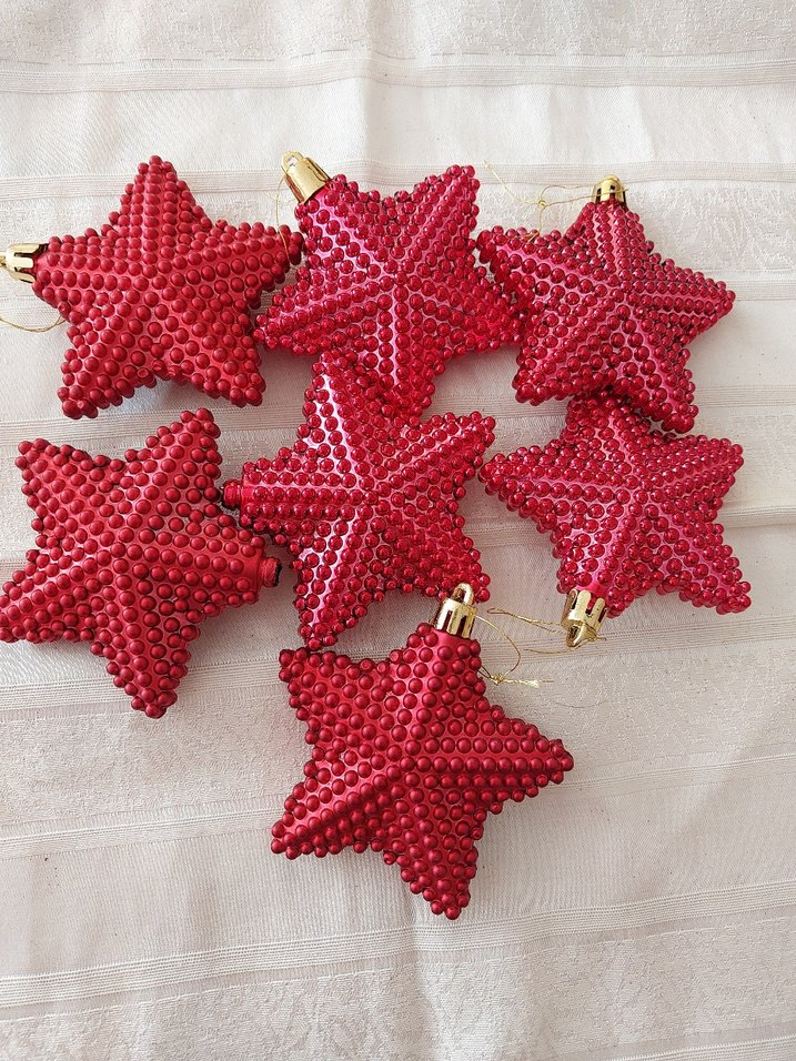 Renkli kırmızı yıldız şeklinde, dokulu yüzeye sahip yılbaşı süsleri. 7 adet