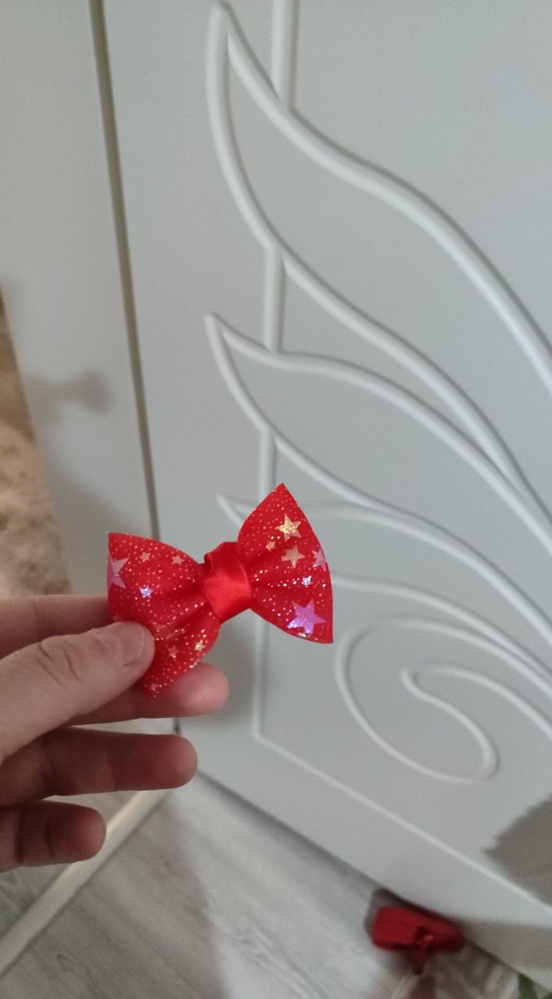 Renkli yıldız desenli, fiyonk detaylı kırmızı çocuk saç tokası, bohem tarzda. Bir kez takildi
