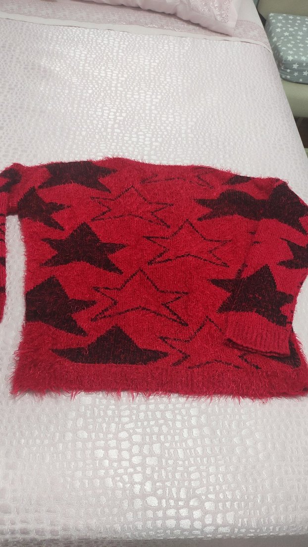 Renkli kırmızı triko kazak, uzun kollu ve yuvarlak yakalıdır. Bol kesimi ve yıldız desenleriyle bohem tarzına uygundur.