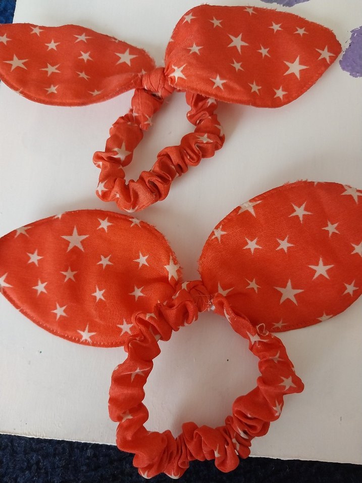 Sentetik kumaştan, renkli yıldız desenli kırmızı lastikli saç bantları. Bohem ve vintage tarzlara uygun.