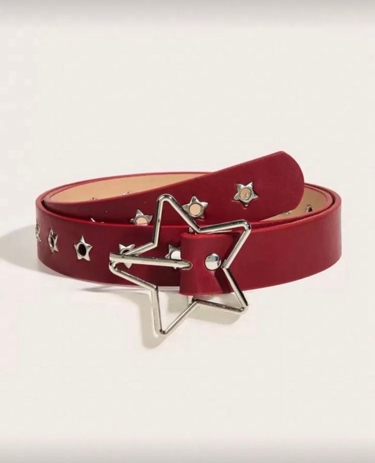 Parlak kırmızı deri kemer, yıldız şeklinde tokası ve yıldız şeklinde zımbalarıyla rock punk ve grunge tarzını yansıtıyor.⭐