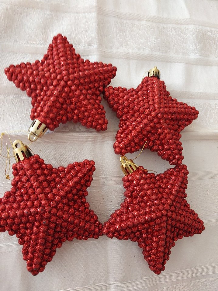 Küçük boncuklarla kaplı kırmızı yıldız şeklinde yılbaşı süsü, 4'lü set halinde sunuluyor.