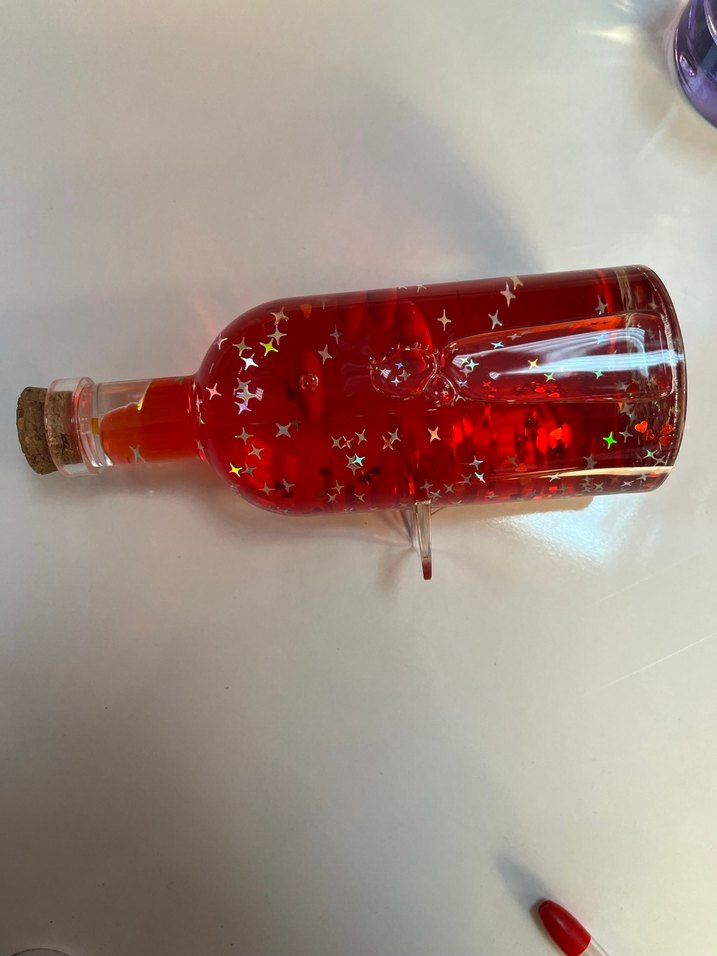 Bu bebek biberonu, parlak kırmızı renkte ve yıldız desenleriyle, mantar tıpa ile tamamlanmıştır.