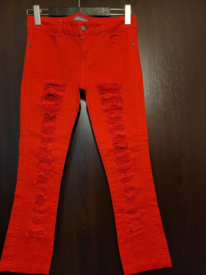Kırmızı renkli, yırtık detaylı, normal boy midi kesim, dar kesim kadın jean. Günlük kullanıma uygun rahat bir model.