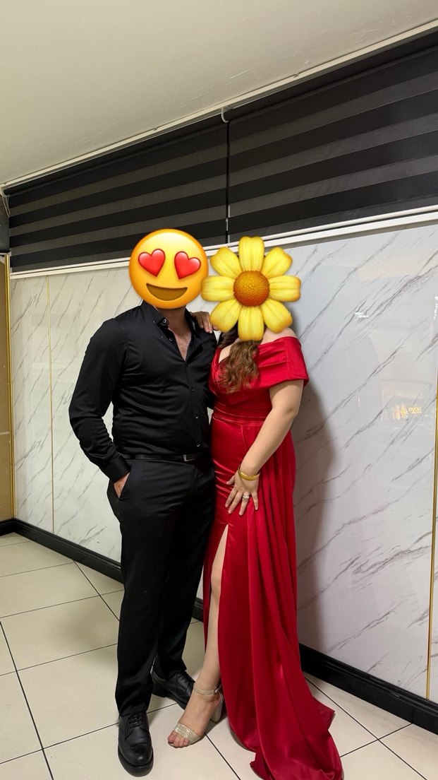 Kırmızı, yırtmaç detaylı düşük omuzda kullanılabilir bir sefer giyildi alt tarafında görselde olduğu gibi zift lekesi var fazla belli bile olmuyor