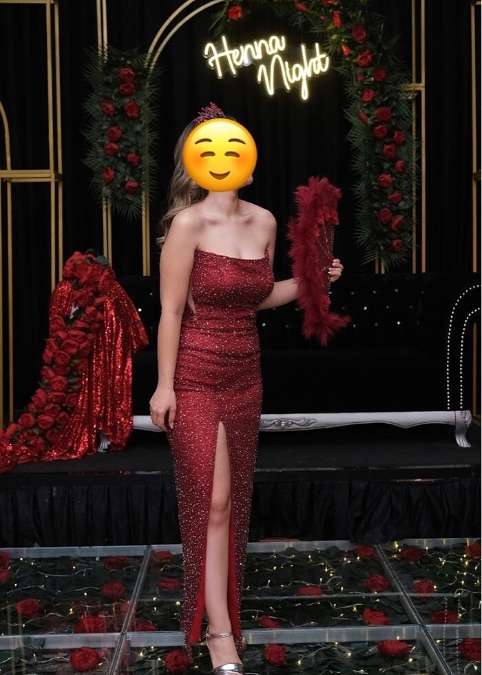 Özel dikim kırmızı yırtmaçlı abiye. Ankara Karumda bir mağazaya özel dikim ile yaptırıldı. Bir kez kına gecemde giydim. Sorunsuz tertemiz bir şekilde bekliyor.