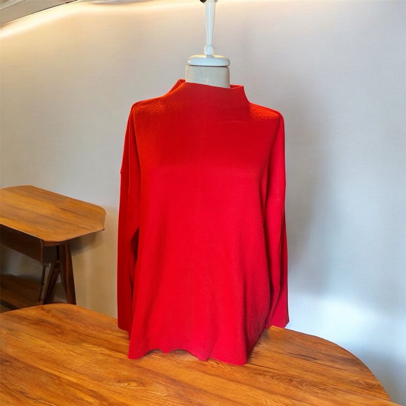 Kırmızı renkli, yüksek yakalı ve uzun kollu kadın kazak, yumuşak ve sıcak kumaştan üretilmiştir. Rahat kesimi ve sade tasarımıyla günlük kullanıma uygundur. Kol altından diğer kol altına kadar 70 cm Enseden etek ucuna kadar 62 cm