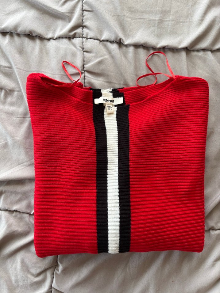 Uzun kollu, yüksek yakalı kırmızı kadın kazak. Çizgili deseniyle trend günlük stil için uygundur.