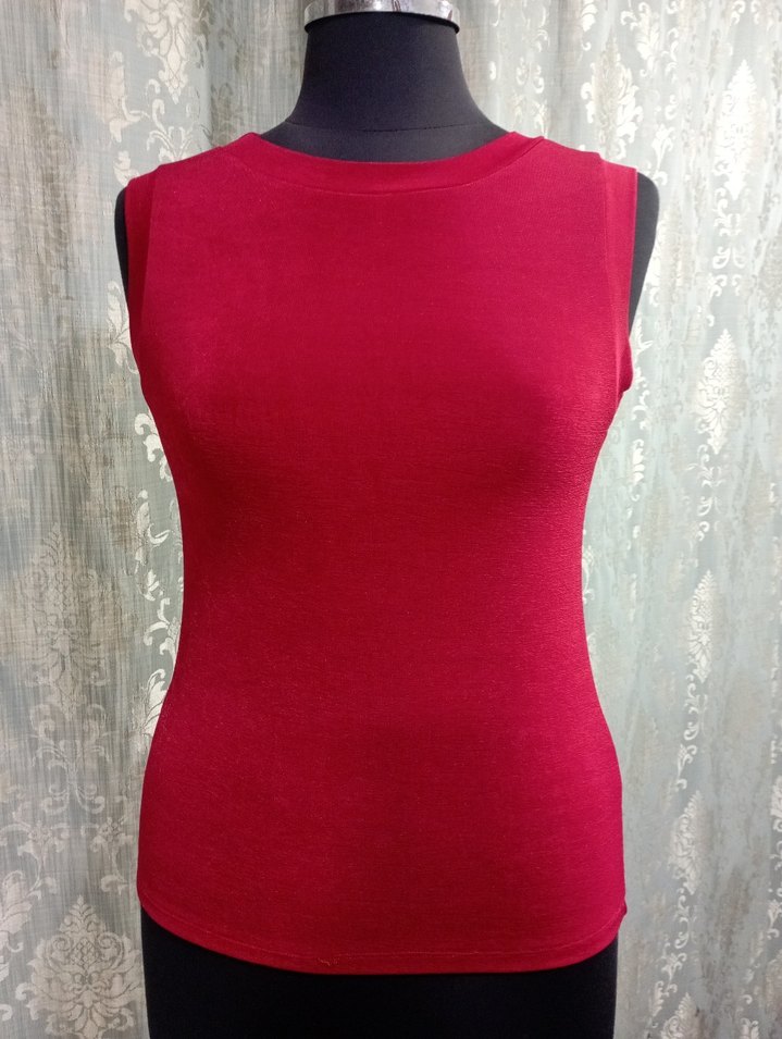 Kırmızı renkte, yüksek yakalı ve kolsuz, vücuda oturan kadın atletYumuşak sentetik kumaştan yapılmış, günlük kullanıma uygun minimalist ve çağdaş tarzda.