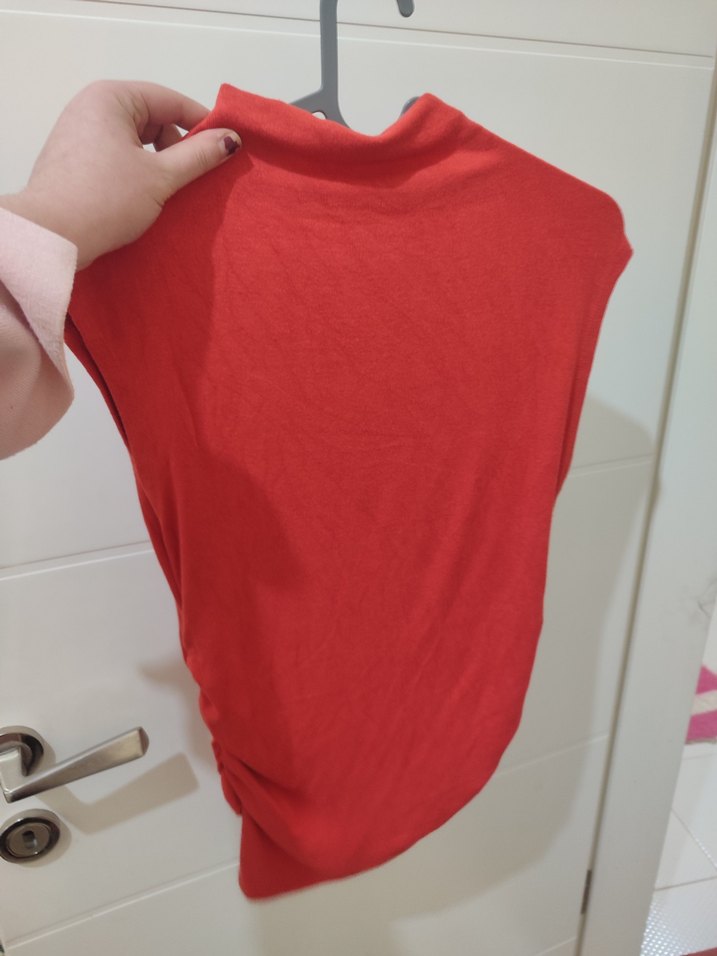 Kırmızı, yüksek yakalı ve kolsuz hamile bluzu, parlak sentetik kumaştan üretilmiş ve drapeli detaylara sahip. Normal midi boyda, minimalist sokak tarzında günlük kullanım için uygun. pamuklu trendyol milla XL beden likralı esnek