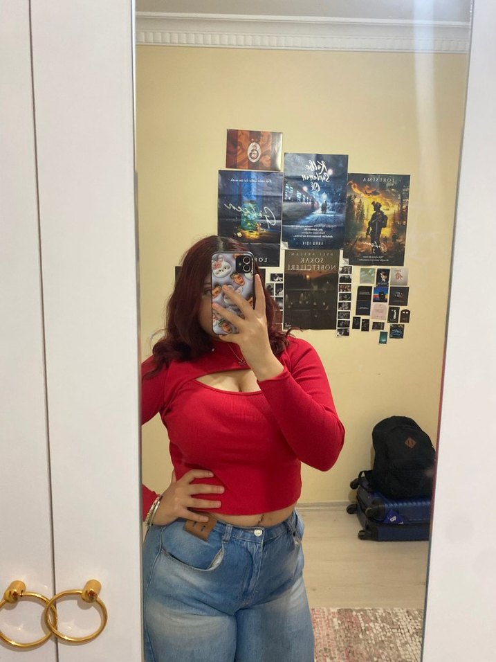 Kırmızı, yüksek yakalı crop top, uzun kollu ve şık bir kesim detayıyla denim kumaştan üretilmiştir. Günlük kullanıma uygun rahat bir sokak stili sunar.