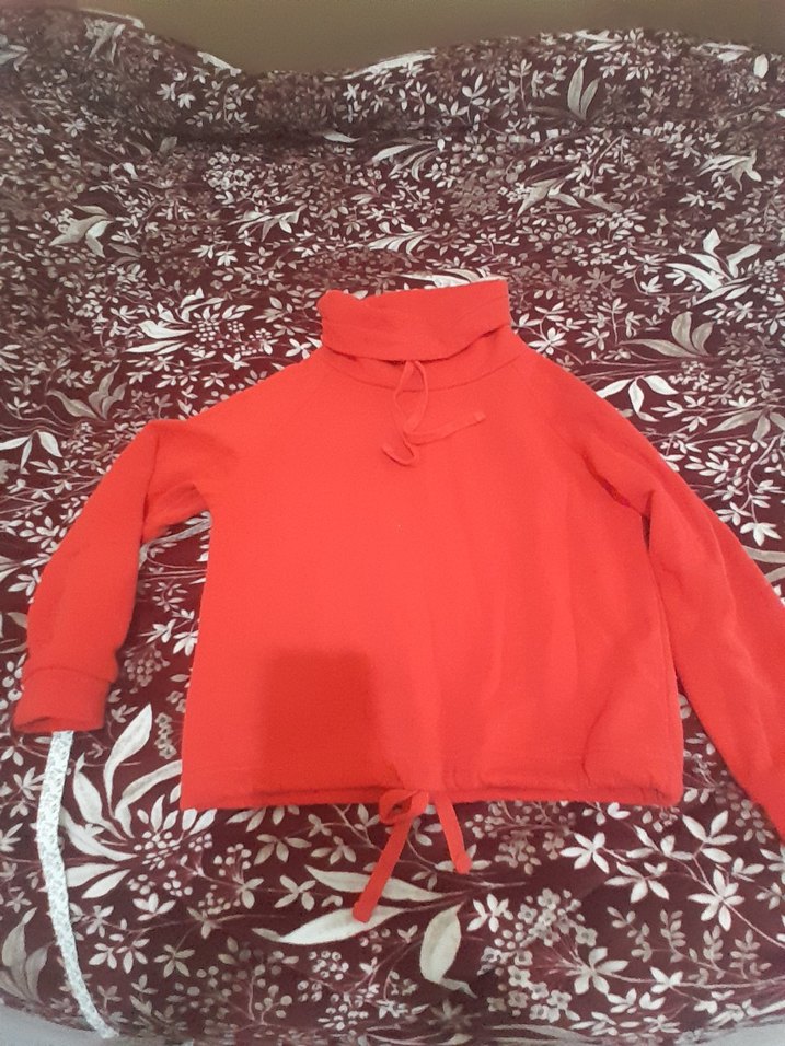 Kırmızı, yüksek yakalı ve uzun kollu kadın sweatshirtü. Yumuşak örme kumaştan, kısa boyda ve bol kesimdir. Yakada ve etekte bağcıkları bulunur.