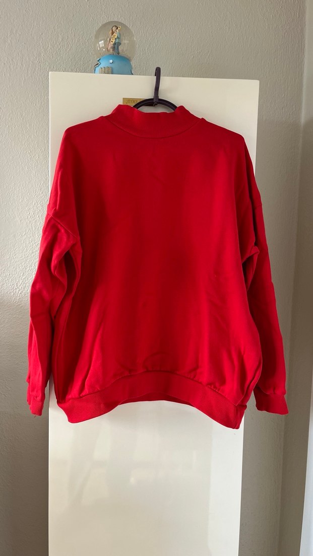 Yüksek yakalı, uzun kollu ve bol kesim kadın sweatshirt. Yumuşak ve sıcak kumaştan, düz ve desen içermeyen canlı kırmızı renkte, günlük kullanım için uygundur.