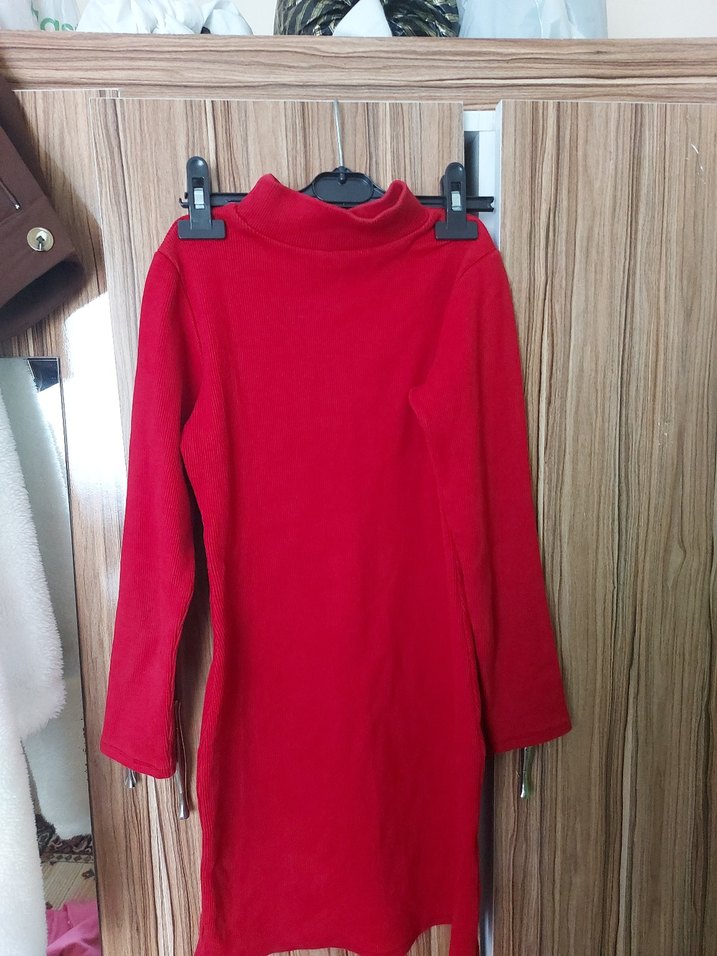 Kırmızı, yüksek yakalı ve uzun kollu, yumuşak ve sıcak kumaştan yapılmış, midi boy ve drapeli kadın triko elbise. Rahat sokak stili için uygundur.