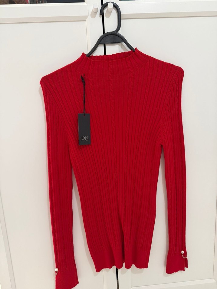 Kırmızı, yüksek yakalı, uzun kollu ve inci detaylı manşetlere sahip triko kazak, günlük kullanıma uygun rahat ve şık bir modeldir.
