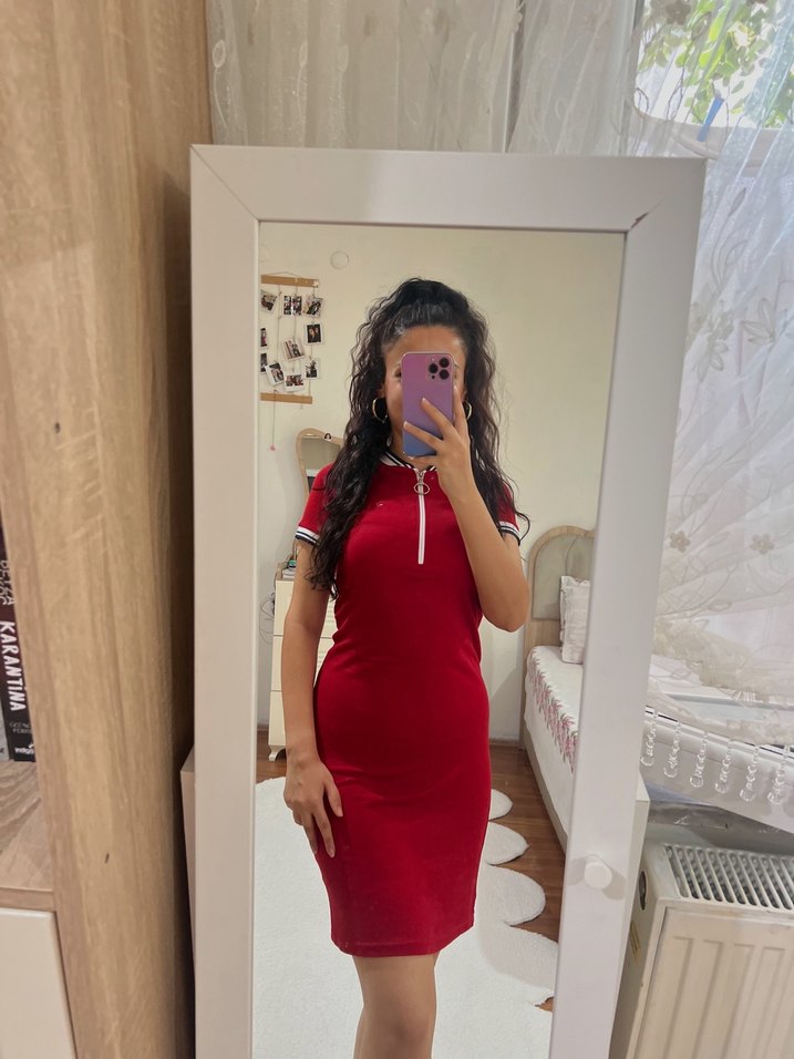 Parlak sentetik kumaştan, yüksek yakalı ve kısa kollu, vücuda oturan kırmızı midi elbise. Günlük kullanıma uygun, zahmetsiz şıklık sunar.