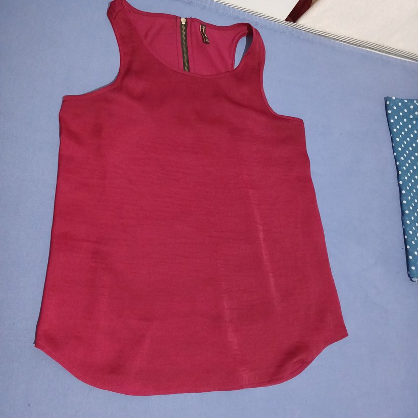 Kırmızı, parlak ve ipeksi kumaştan kolsuz bluz. Yüksek yakalı, fermuarlı ve bol kesimdir. Sokak tarzına uygun