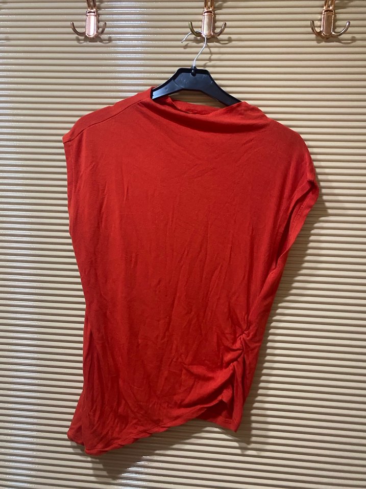 Kolsuz, yüksek yakalı ve drapeli kırmızı kadın gömleği. Parlak keten kumaştan, normal midi boyda, minimalist ve rahat kesim. Günlük kullanıma uygun.