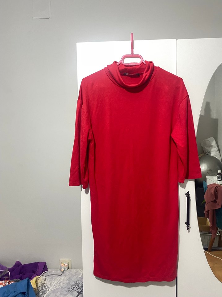 Yüksek yakalı, uzun kollu ve drapeli kırmızı midi triko elbise, yumuşak ve sıcak kumaştan günlük kullanım için uygundur.