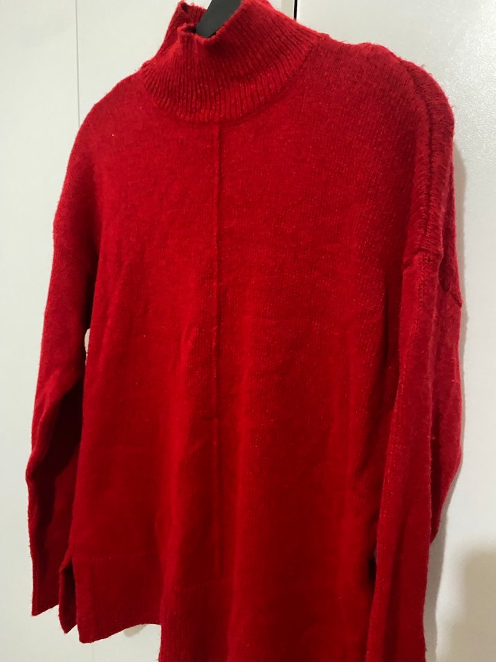 Kırmızı örgü kadın kazak, yüksek yakalı ve uzun kolludur. Yün malzemeden üretilmiş, bol kesim ve normal uzunluktadır. Parlak kumaşıyla sıcak bir dokunuş sunar. Görüldüğü gibidir