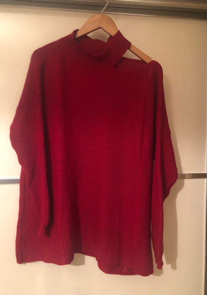 Koyu kırmızı renkte, ince ,örgü kadın kazak. Yüksek yakalı, uzun kollu ve bol kesimdir. Rahat ve günlük kullanıma uygundur.iki omuz ,koltuk arası 67cm,boy 67cm .ince ve esnektir .XL ve XXL bedenler rahatlıkla giyebilir