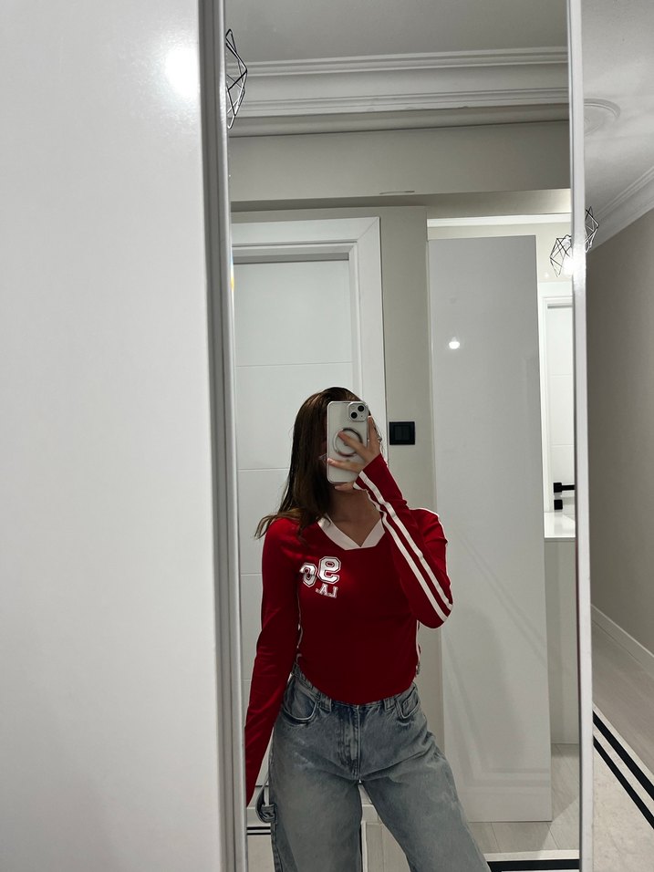 Kırmızı renk, yüksek yakalı ve uzun kollu bu kadın, bluzu bol kesimiyle rahat ve trend görünüyor. Beyaz şeritler ve baskılarla sokak stilini yansıtıyor, günlük kullanıma uygun.