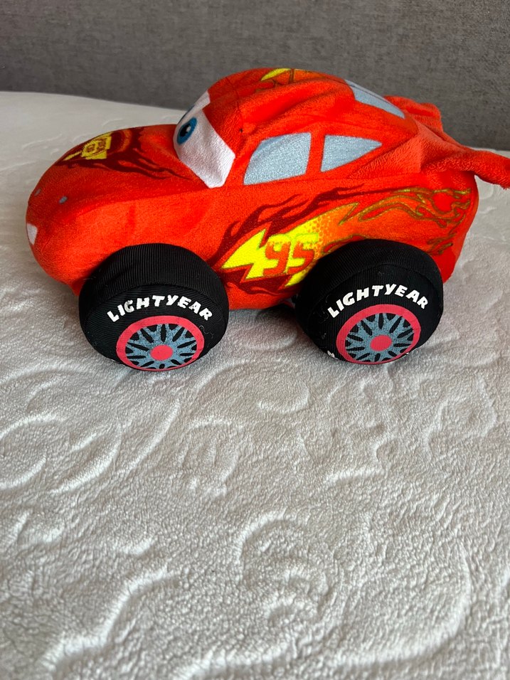 Canlı kırmızı renkte, yumuşak kumaştan yapılmış oyuncak araba. Detaylı tekerlekleri ve alev desenleri bulunur.