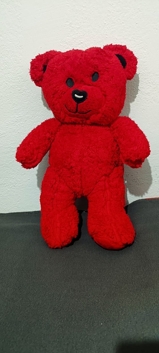 Yumuşak ve renkli kırmızı peluş ayıcık, dostane yüz ifadesiyle sarılmak ve oyun için uygundur. 60cm